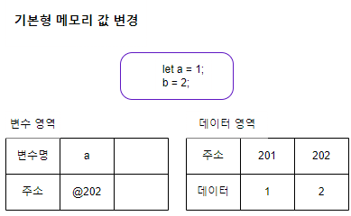 초기 단계에서 a와 b는 같은 값을 가지고 있다. 이후에 b에 새로운 값 2가 할당이 되면 메모리 상에서 새로운 주소 202에 2가 할당이 되고 b는 202를 참조하게 된다. 결과적으로 a와 b는 서로 다른 메모리 주소를 가지게 된다. 서로 다른 주소 값을 참조하고 있으므로 a===b는 false이다.