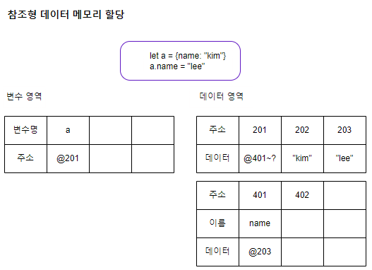 기본형 데이터는 1에서 2로 변경 시에 기존값 1이 저장된 메모리 주소 201에서 새로운 값이 저장된 메모리 주소 202로 변경이 된다. 새로운 값 2는 사용 가능한 빈 메모리 공간에 할당이 되고, 이전 값 과는 완전 별개의 메모리 주소를 갖게 된다. 따라서 기본형 데이터는 값이 변경 되더라도, 원본 데이터 자체가 변경 되는게 아니라, 새로운 데이터가 새로운 메모리 공간에 할당되어 불변성이 유지된다. 참조형 데이터를 살펴 보면, 객체 a의 “name” 속성 값을 변경하는 경우를 생각해보면, 객체 a는 “name” property 값이 변경이 되어도 참조하는 메모리 주소 201은 변경되지 않는다. a 객체의 "name" property가 "kim" 에서 "lee"로 변경 되어도 “name” property 프로퍼티가 참조하는 데이터 주소가 202에서 203으로 변경이 되었고 객체 a는 그대로 201을 참조한다. 이는 참조형 데이터가 실제 데이터 보다는 데이터가 가리키는 참조를 저장하기 때문이다. 따라서 객체 내부의 속성을 변경하더라도 참조하는 주소는 그대로 유지가 된다. 이러한 특성 때문에 참조형 데이터는 가변성을 가진다.