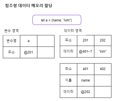 참조형 데이터는 기본형 데이터와는 다르게 데이터 영역에서 바로 데이터 값이 할당되지 않는다. 참조형 데이터는 별도의 데이터 영역이 추가로 존재한다. 그 이유는 객체의 경우 여로 개의 변수와 값을 모아놓은 그룹이기 떄문에 데이터 영역 주소 201에 모든 데이터의 값을 저장할 수 없다. property 를 저장하는 메모리영역 401이 존재하고 property “name”은 문자열 “kim” 말고도 다른 값을 저장할 수도 있기 때문에 401에 메모리 주소에 바로 값을 할다하지 않고 데이터 주소인 202를 할당하고 202에 “kim”을 할당한다. 201 주소의 메모리 데이터가 @401~?의 의미는 객체의 property는 “name”에 더해 계속해서 확장될 수 있다는 의미이다.